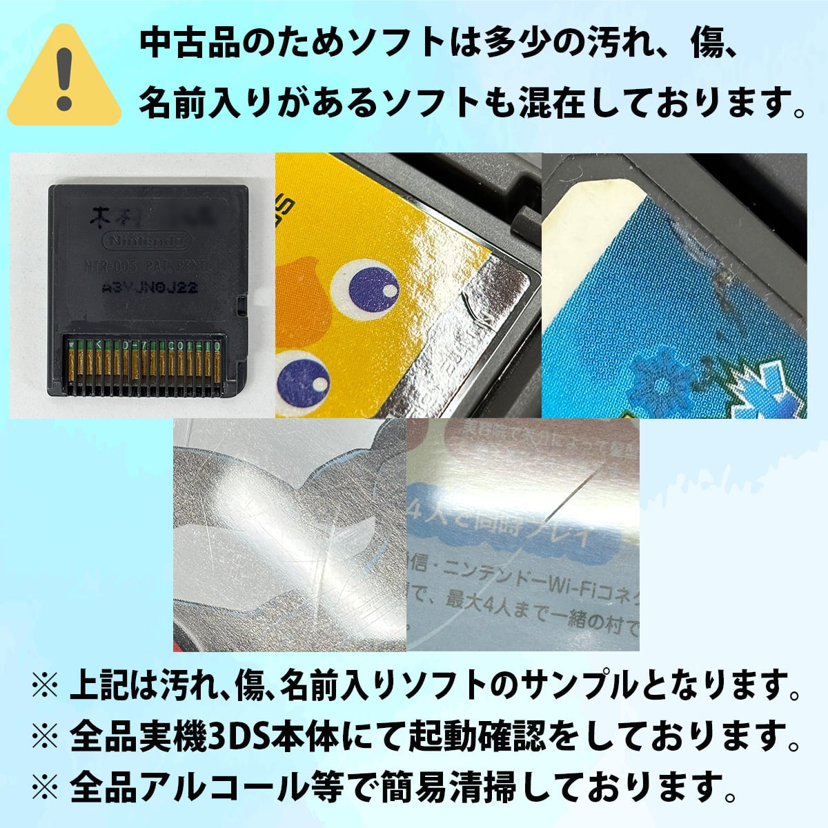 ・ソフト端子を綿棒で清掃、ソフト本体を無水アルコール等で簡易クリーニングしておりますが、落ちない汚れや傷、日焼け跡などが残っているソフトもございます。