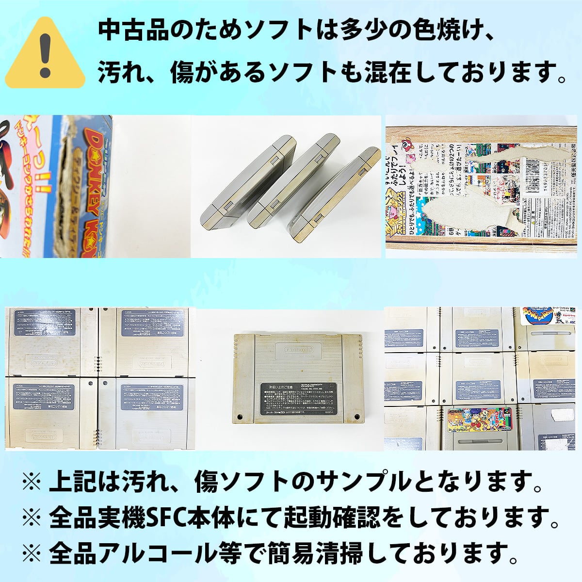 ・ソフト端子を綿棒で清掃、ソフト本体を無水アルコール等で簡易クリーニングしておりますが、落ちない汚れや傷、日焼け跡などが残っているソフトもございます。