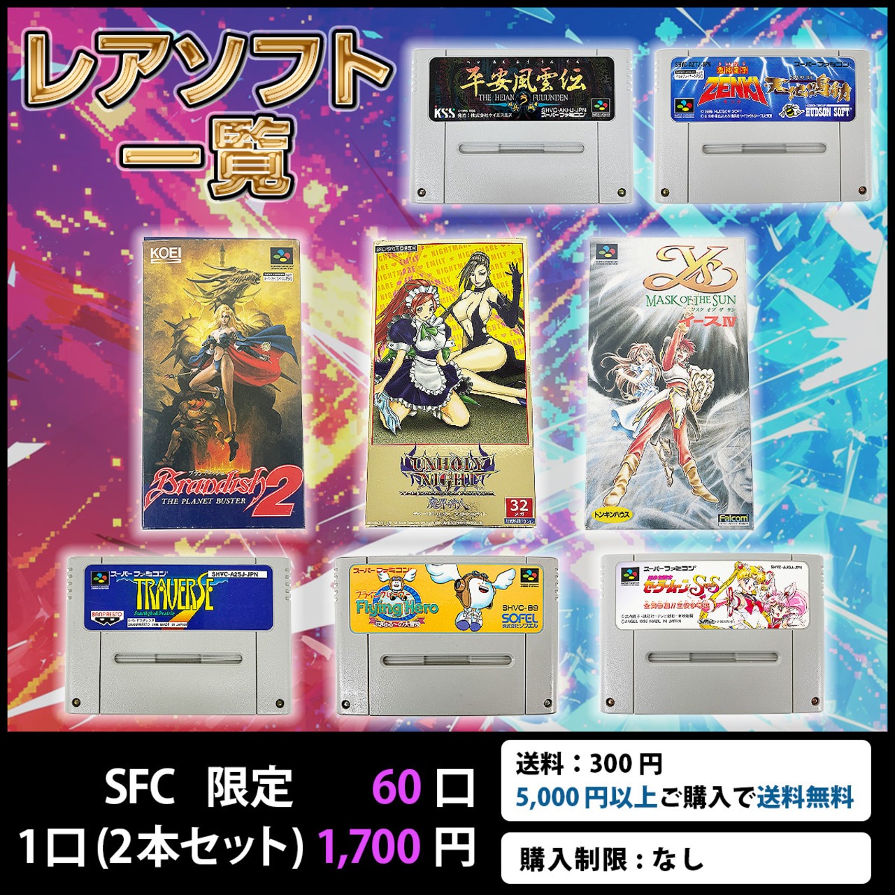 SFCレトロゲームセレクトオリジナルパックを1口2本セット1,700円(税込/送料300円 ※5,000円以上購入で送料無料)で販売。