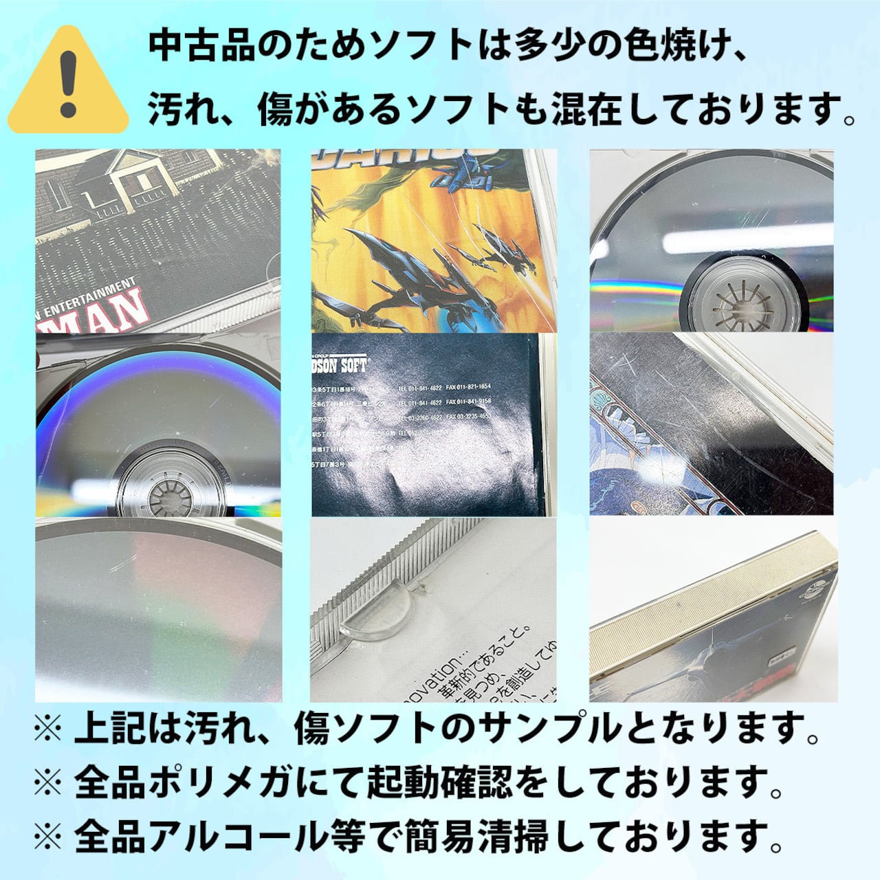 ・ソフト端子を綿棒で清掃、ソフト本体を無水アルコール等で簡易クリーニングしておりますが、落ちない汚れや傷、日焼け跡などが残っているソフトもございます。