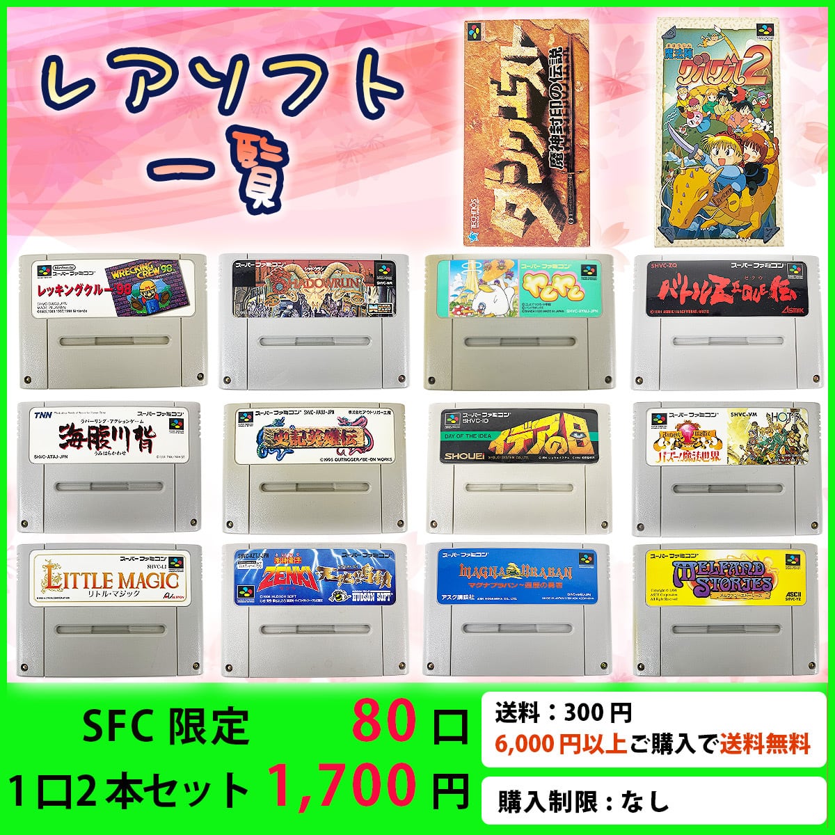 SFCレトロゲームセレクトオリジナルパックを1口2本セット1,700円(税込/送料300円 ※6,000円以上購入で送料無料)で販売。